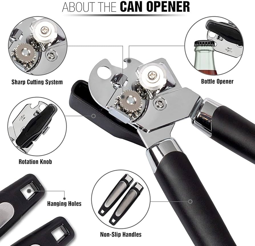 This manual can opener with ergonomic handles and a turn-knob mechanism. Designed for ease of use, it cleanly cuts through can lids without leaving jagged edges. The opener combines stainless steel components with comfortable, non-slip handles, making it a reliable kitchen essential for opening canned food.