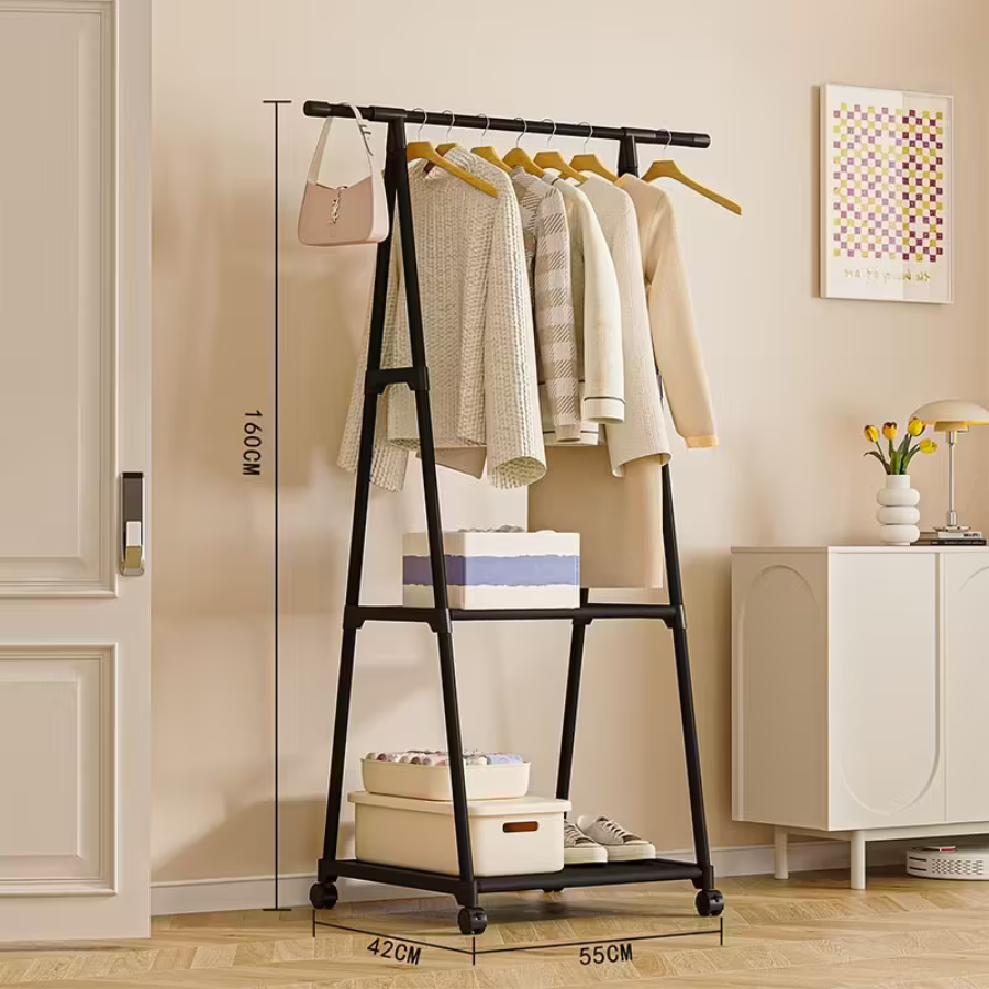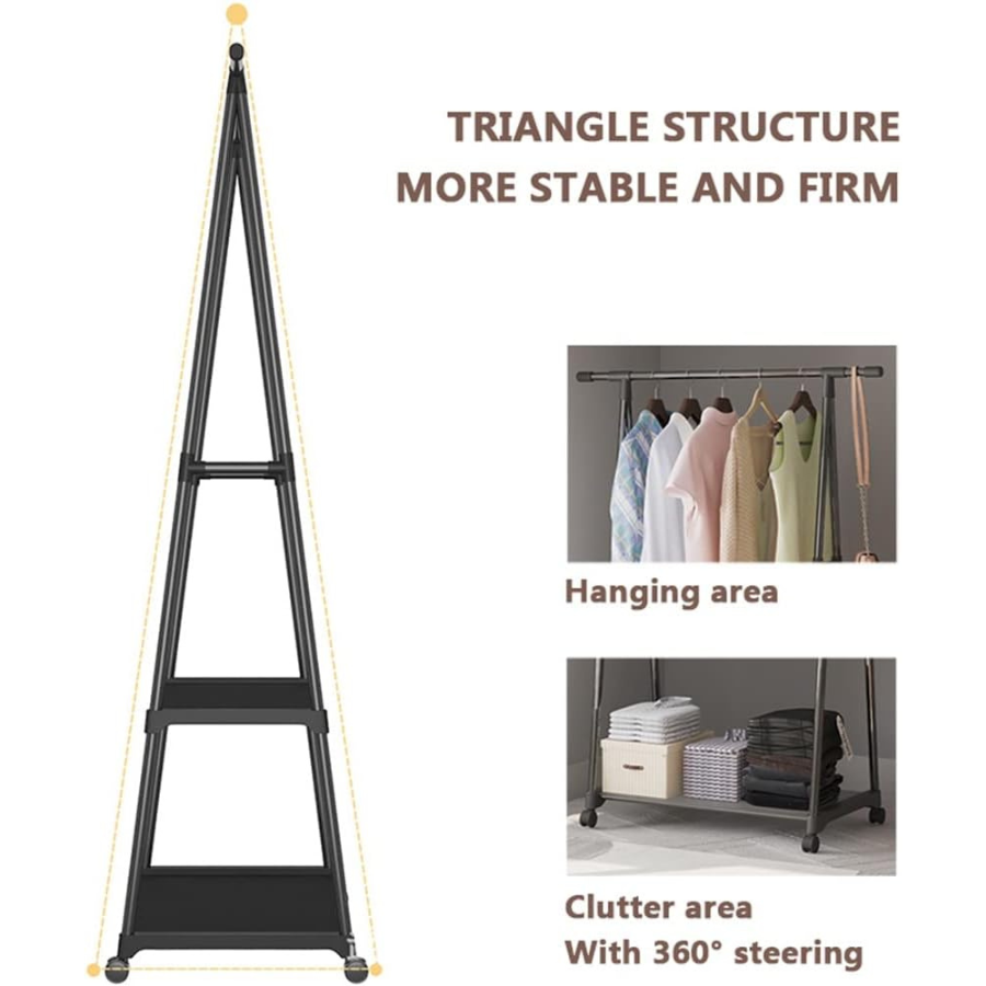 Keep your clothes organized and your space clutter-free with this Triangle Multifunctional Clothing Rack. Designed with a sturdy steel frame, it offers a strong hanging rod for clothes, two spacious lower shelves for shoes, pillows, or storage boxes, and a side hook for bags or hats. Perfect for bedrooms, laundry rooms, and entryways, this portable wardrobe rack combines functionality with a sleek modern look.